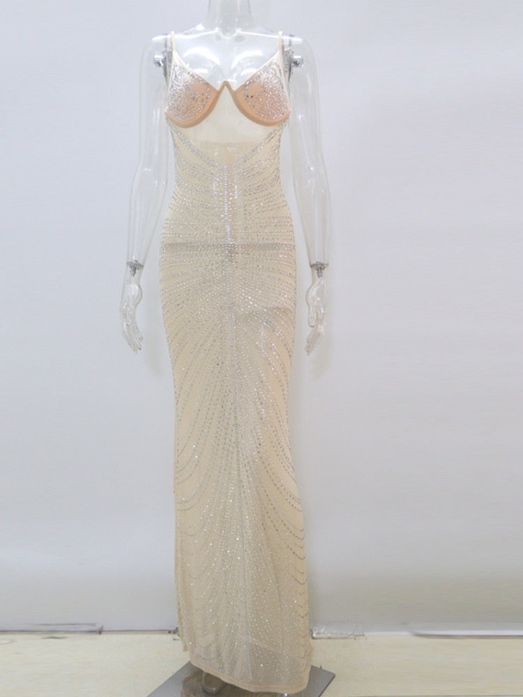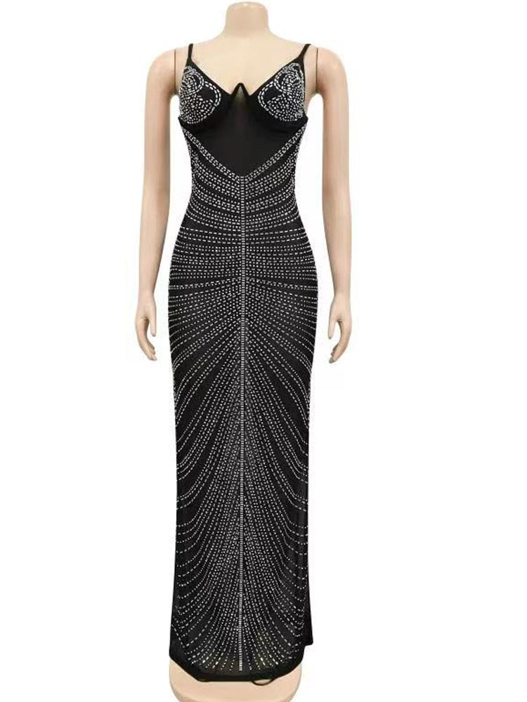 Gender : Black Mesh Sheer Rhinestones Maxi Dress Gown
