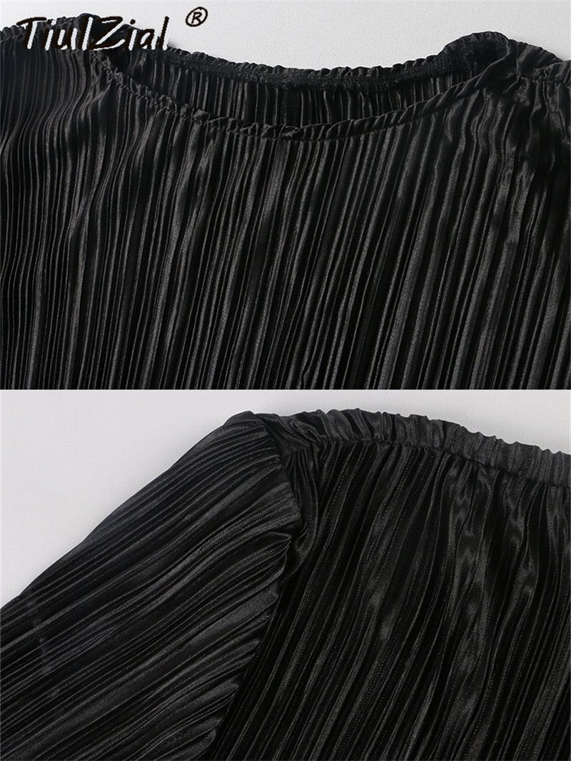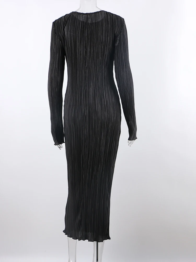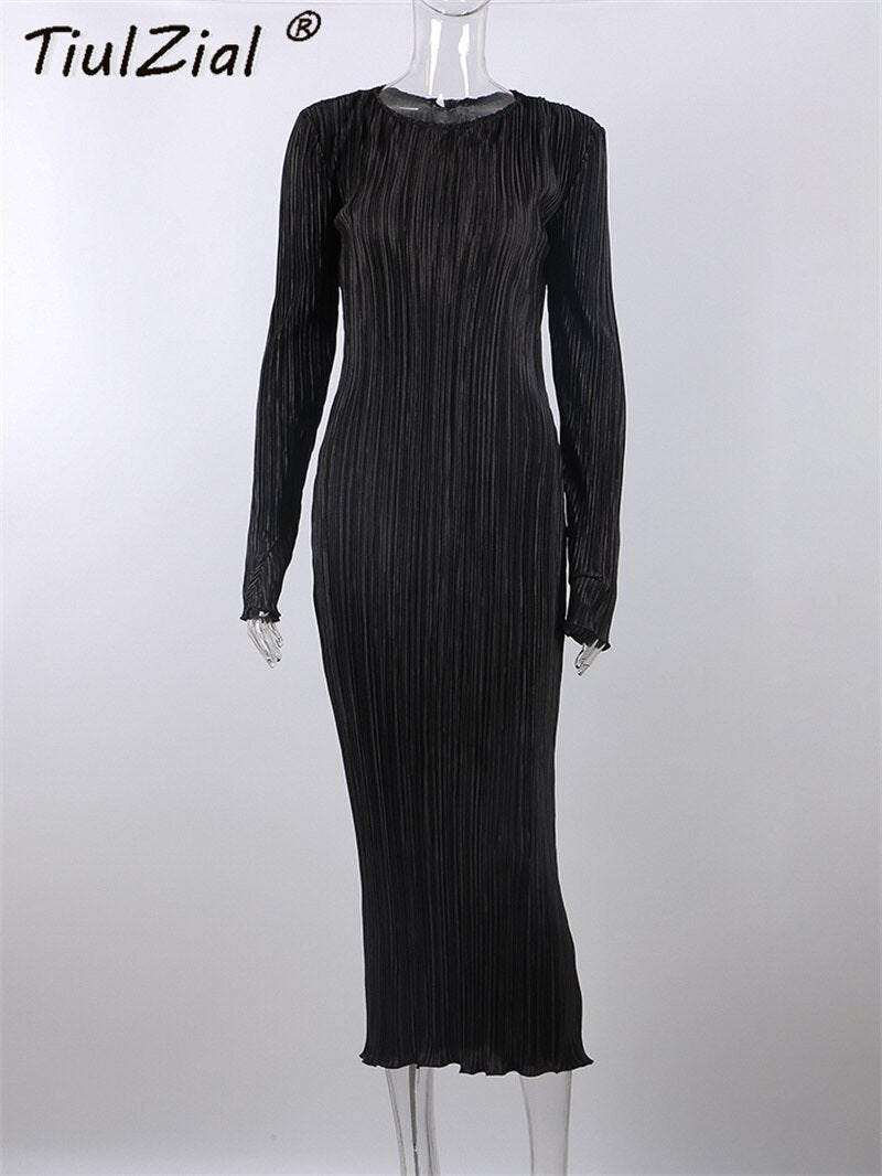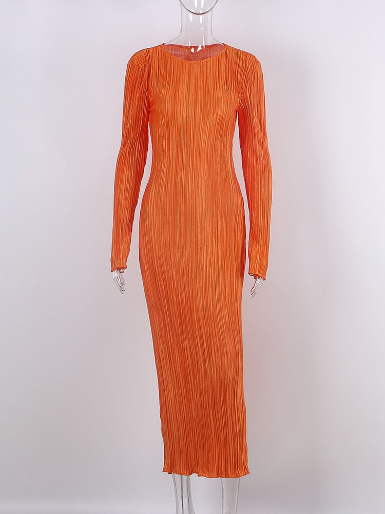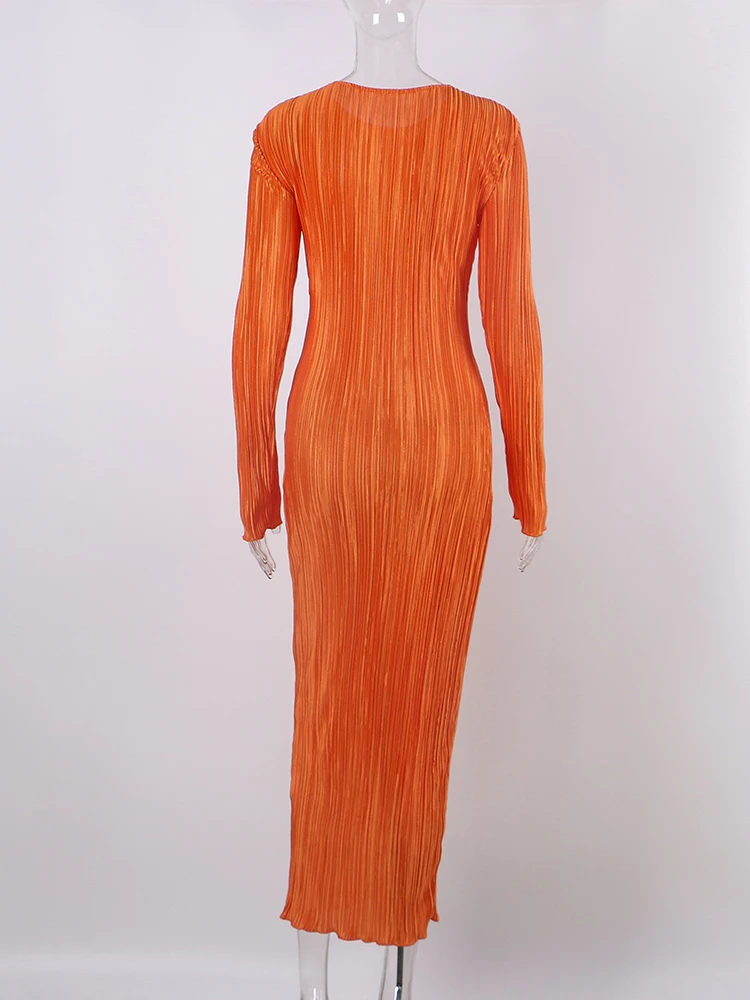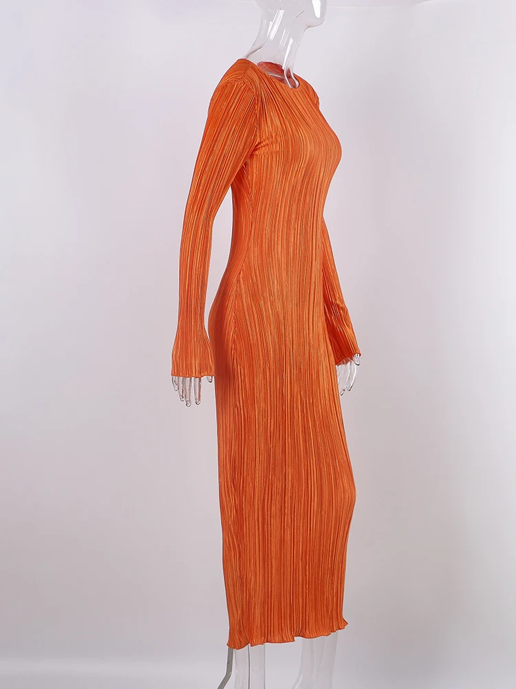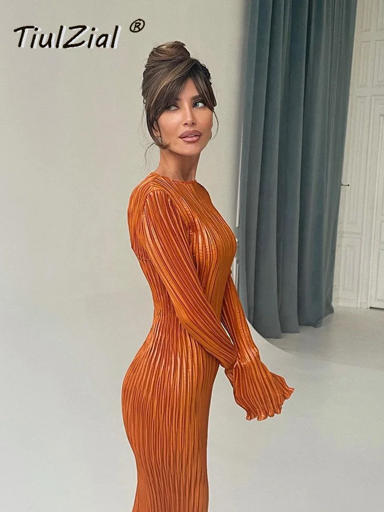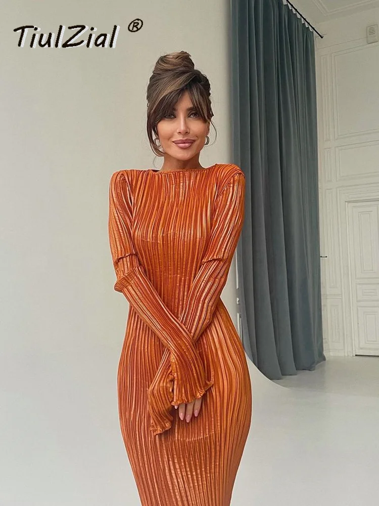 TiulZial Basic Orange Maxi Bodycon Dress Autumn Summer Long Sleeve Pleated Dress 2022 Plisse Casual Dresses Women