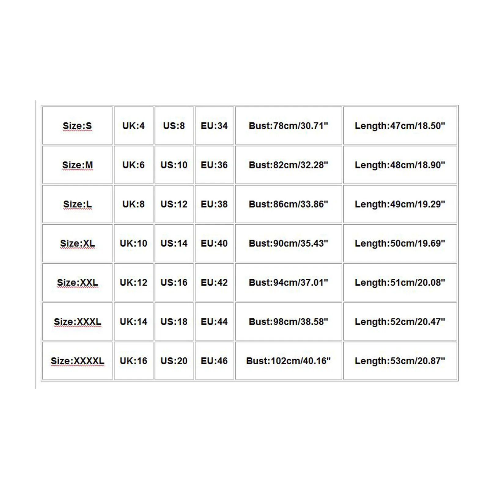 Size | UK | US | EU | Bust | Length |