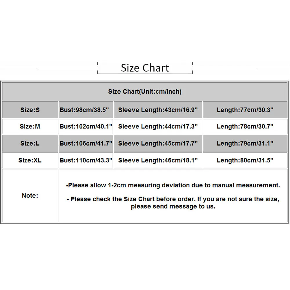 | Size:M | Bust:102cm/40.1" | Sleeve Length:44cm/17.3" | Length:78cm/30.7" |